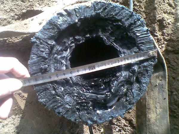 采油三廠馬寨注水干支線1989年投入使用,距今已經22年。管線規格為Ø245×20×1.6km、Ø127×12×0.53km,經割管檢查后發現管線內壁結垢厚度約50mm,管線內徑僅剩105mm,管線內結垢垢質堅硬且不規則、有結餾,清洗施工難度較大,針對這一情況采油三廠邀請具備清洗資質的專業公司進行現場勘查,我公司接到邀請后迅速組織技術人員,在現場踏勘過程中,其他清洗公司技術人員看過管線內結垢情況后都認為這個工程施工難度太大。我公司技術人員針對現場管線內壁結垢厚且硬、不規則、結餾等特點作出了詳細可行的施工方案及報價,采油三廠主管部門看過以后非常滿意,并以此方案及報價作為標準進行招標。