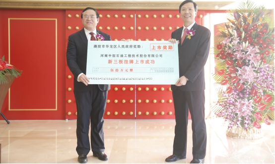 儀式現場,濮陽市華龍區人民政府為獎勵河南中拓石油工程技術股份有限公司新三板上市成功,特此獎勵50萬元,由徐慧前副市長頒發獎金。